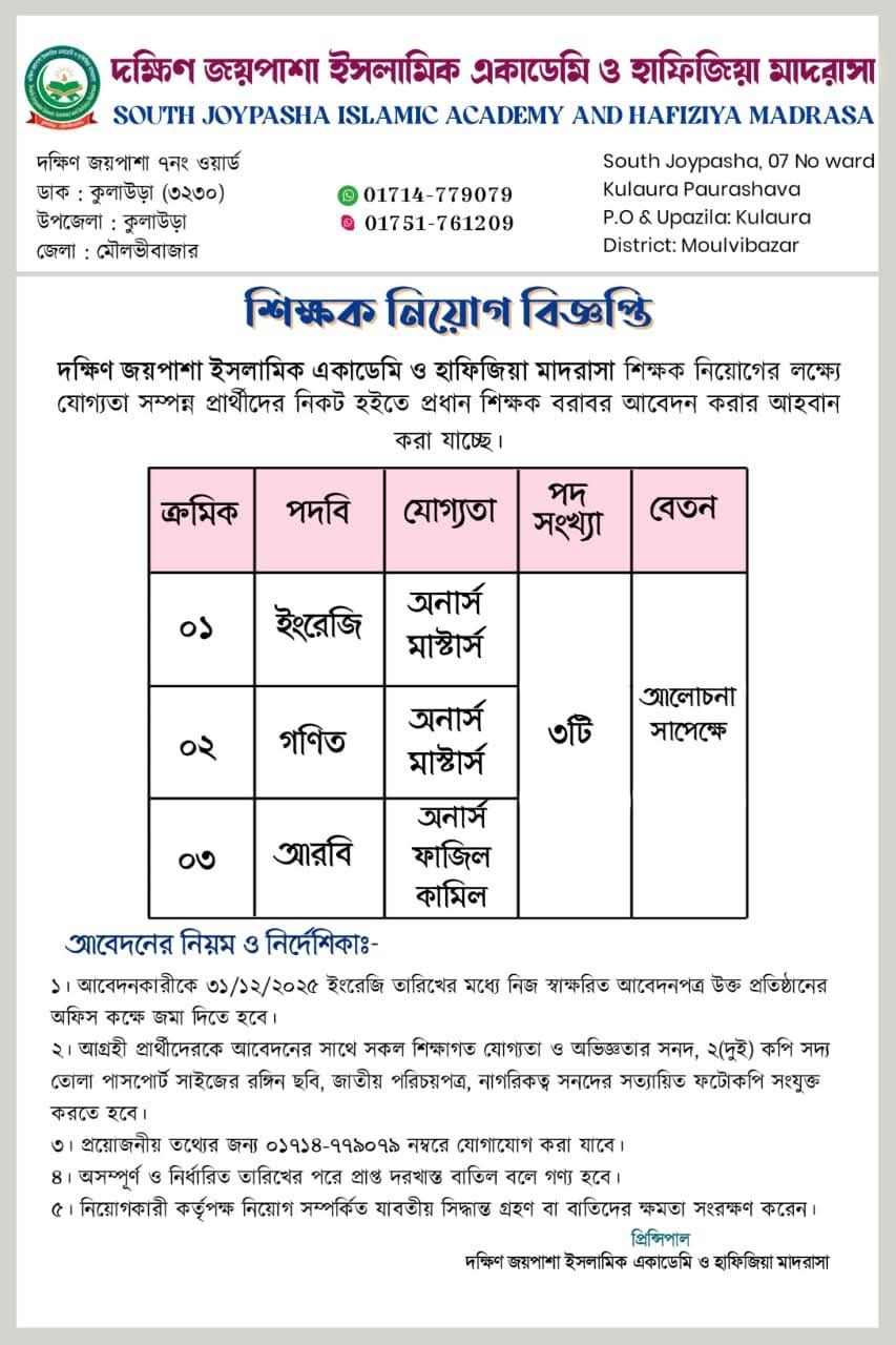নিয়োগ বিজ্ঞপ্তি: দক্ষিন জয়পাশা ইসলামিক একাডেমি ও হাফিজিয়া মাদরাসা